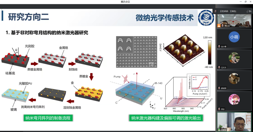 王俊生教授结合自己多年从事海洋传感与智能检测技术研究所取得的成果,从海洋传感与智能检测技术的背景和意义入手,围绕检测基本原理、研究内容、进展和典型应用举例,重点介绍了微流控芯片检测技术、微纳光学传感技术、电化学传感与处理技术、分子电子器件传感技术、计算光学成像与检测技术、人工智能检测技术等6个方向,总结了相关瓶颈问题、技术难点,并针对科学研究及学科建设提出了建议。报告会后,王俊生教授就微纳光学传感、计算光学成像等热点问题与师生进行了交流。